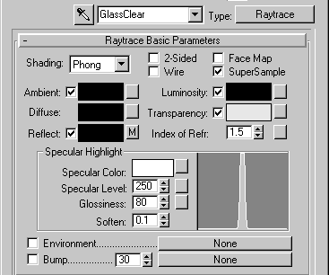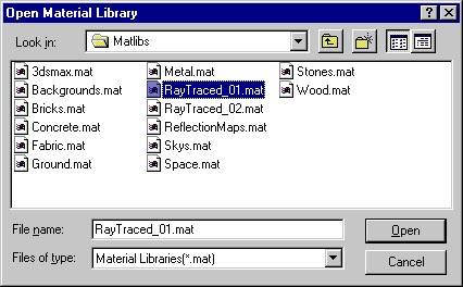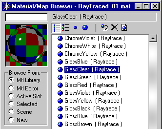 Select RayTraced_01.mat and then click Open. A library of ray-traced materials is loaded into the Material Editor. Select ClearGlass from the list of materials by double-clicking: