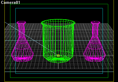 Name this flask Pb(NO3)2 Flask. In the camera view, right-click on the Camera viewport label and enable Show Safe Frame. Reposition the camera, flasks and/or beakers so that they fit within the green frame:
