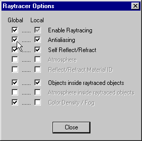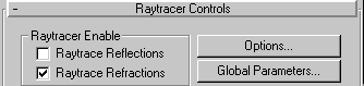 For your final rendering of the day, select any raytrace material in the material editor and open its Raytracer Controls rollout. Click the Options button. In the Raytracer Options dialog box, enable Global Antialiasing and close the dialog box: